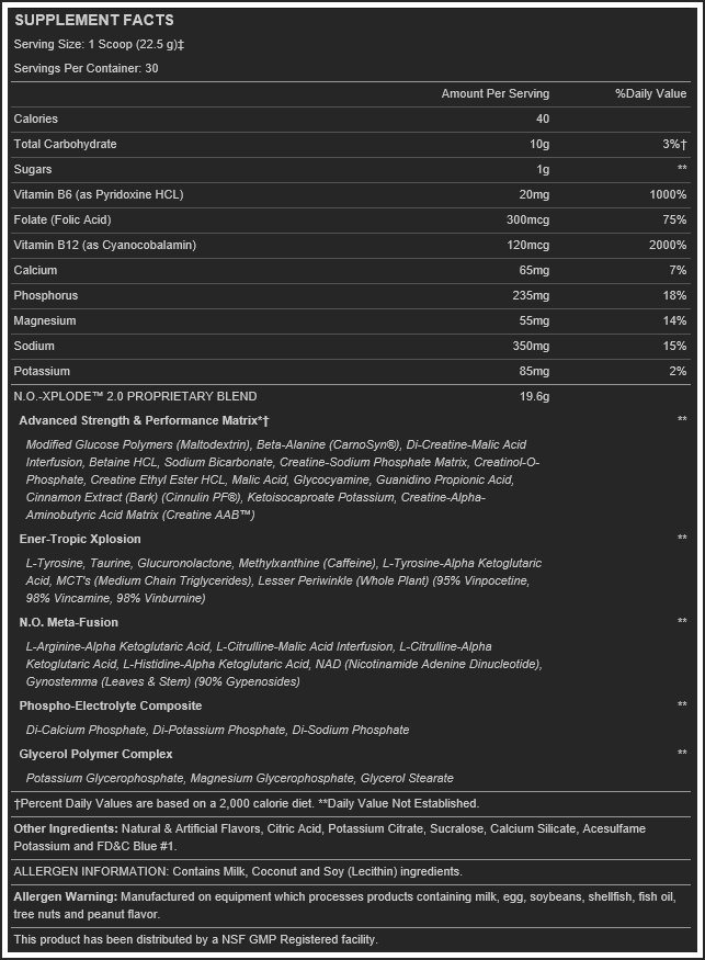 Bsn No Xplode Nutrition Facts Bsn No Xplode Nutrition Facts, Calories Moo Shu Chicken, Calories Burned 10 Minutes Rowing Machine, Frozen Limeade Concentrate Nutrition Facts, How Many Calories Does Running 1.7 Miles Burn, How Many Calories In Bob Evans Grits, Flatout Low Calorie Bread ... BSN NO-Xplode Pre Workout Powder - Best Price Nutrition NO XPLODE MASTER PERFORMANCE BLEND Myogenic Matrix 5.1g Creatine Blend (Creatine Monohydrate, Creatine Anhydrous), Taurine, Di-Calcium Phosphate, Di-Sodium Phosphate, AstraGIN Proprietary Blend [Astragalus membranaceus Extract (root), Panax notoginseng Extract (root)] Endura Shot 2.9g Calories in N.O. xplode pre workout - Nutrition Facts for N.O. xplode ... In a N.O. xplode pre workout ( 1 Scoop ) there are about 30 calories out of which 0 calories come from fat. The total fat content of 1 Scoop N.O. xplode pre workout is 0 g. Within the fat content, a N.O. xplode pre workout contains 0 g of saturated fat, 0 g of trans fat, 0 g of polyunsaturated fat and 0 g of monounsaturated fat. Total Carbs in N.O. xplode pre workout - Nutrition Facts for N.O ... A single 1 Scoop N.O. xplode pre workout contains about 140 mg of sodium. Sodium causes the body to retain water and a low sodium diet helps in controlling high blood pressure and water build up. Any item containing less than 5 mg of sodium is considered a no sodium item and considered low sodium if the sodium content is below 140 mg per serving.