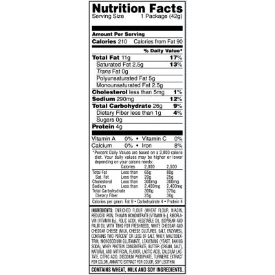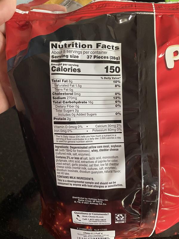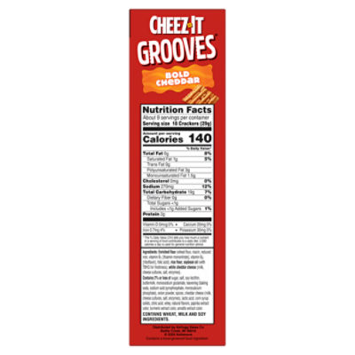 Cheez-It Baked Snack Cheese Crackers Reduced Fat ingredients enriched flour (wheat flour, niacin, reduced iron, vitamin b1 [thiamin mononitrate], vitamin b2 [riboflavin], folic acid), vegetable oil (high oleic soybean, soybean, palm, and/or canola oil with tbhq for freshness), cheese made with skim milk (skim milk, whey protein, salt, cheese cultures, enzymes, annatto extract color), contains … Cheez-It® Puff'd™ Scorchin' Hot Cheddar Snacks Cheez-It ® Puff'd ™ Scorchin' Hot Cheddar Snacks 5.75oz Pack $3.49 Select Flavor White Cheddar Scorchin' Hot Cheddar Double Cheese Add to Cart Taste the fun of puffy and airy, bite-sized squares baked with 100% real cheese crispiness and a fiery kick, inside and out. Cheez-It* Original Crackers - SmartLabel™ According to Health Canada, the most common food allergens are eggs, milk, mustard seeds, peanuts, seafood (fish, crustaceans, shellfish), seasame seeds, soybeans ...