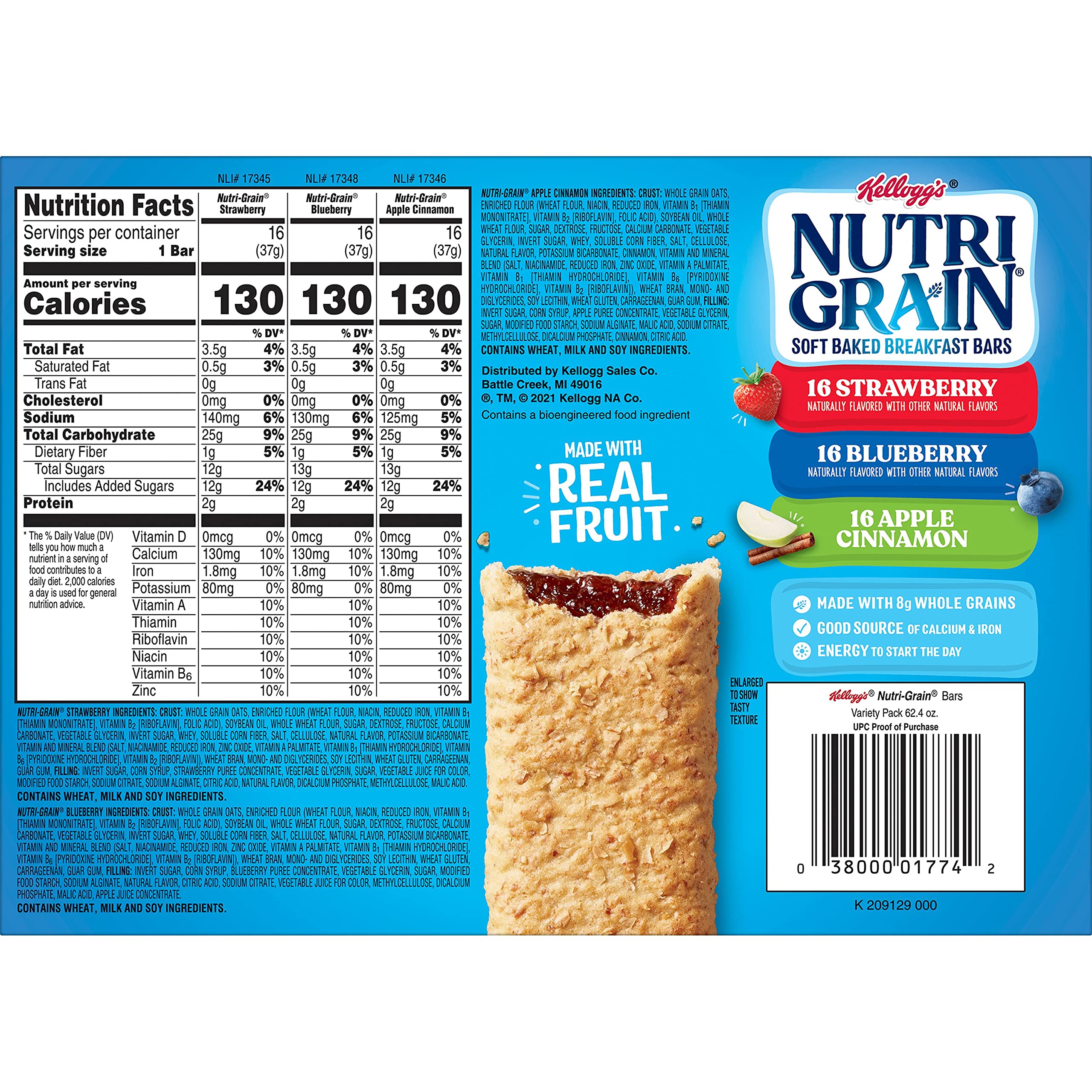 Health Claim Notification for Whole Grain Foods with Moderate Fat ... The Kraft notification states that in order for foods to qualify for the proposed claim the foods must: (1) contain a minimum of 51% whole grains (using dietary fiber as a marker); (2) meet the ... Kellogg's® Nutri-Grain® Soft Baked Breakfast Bars Blueberry - SmartLabel™ 130 Calories 0.5 g Sat Fat 130 mg Sodium 13 g Sugar Nutrition Facts Servings Per Container 8 Serving Size 1 Bar (37 g) *The % Daily Value (DV) tells you how much a nutrient in a serving of food contributes to a daily diet. 2,000 calories a day is used for general nutrition advice. Information last updated on 03-05-2022 by Kellogg's