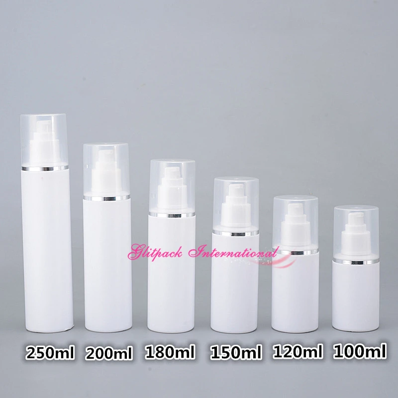 100 ml 120 ml 150 ml 180 ml 200 ml 250 ml botol isi ulang kosong botol plastik HDPE putih Alami penutup logam perak rim cetak