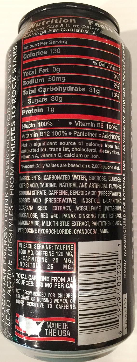 Rockstar energy drink label. Beverages, ROCKSTAR, Energy drink nutrition facts and analysis. Beverages, ROCKSTAR, Energy drink contains 0 g of saturated fat and 0 mg of cholesterol per serving. 31 g of Beverages, ROCKSTAR, Energy drink contains 0.00 mcg vitamin A, 0.0 mg vitamin C, 0.00 mcg vitamin D as well as 0.02 mg of iron, 0.31 mg of calcium, 1.9 mg of potassium. Beverages, ROCKSTAR, Energy drink belong to 'Beverages' food category. Rockstar Energy Drink Keep that same energy with our offering of Rockstar Energy Products, made with delicious fruit flavored energy to keep you on your grind. Rockstar Original Energy Drink, 16 oz, 4 Pack Cans - Walmart.com Rockstar Punched Energy Drink Fruit Punch 16 Fl Oz 12 Count Cans 101 2-day shipping Add $44.99 G Fuel, Sugar Free Energy Drink, Tetris, 16 fl oz 12 cans 3+ day shipping Add $7.24 21.5 ¢/fl oz Red Bull Energy Drink, 8.4 Fl Oz (4 pack) 244 Pickup 3+ day shipping Add $39.00 Rockstar Zero Carb Energy Drink 16 oz Can 6 3+ day shipping Add $13.98 Do Rockstar Energy Drinks Actually Work? - Kill Cliff Unfortunately, Rockstar's website doesn't shed much light on what exactly is in their drink. Fortunately, the internet knows all. Here's the ingredient label for a 16 oz. Rockstar Energy drink: Caffeine. With Rockstar being a leader in the energy drink industry, you know it's going to be packed with caffeine.