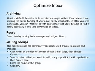 Easy Way To Move Many Gmail Inbox Messages To A Label Or Folder UPDATED video here: struggled with trying to move my Gmail inbox messages all at once to a label or folder. I wou... How to remove emails from Inbox after labeling them? - Gmail ... - Google How to remove emails from Inbox after labeling them? - Gmail Community. Gmail Help. Sign in. Help Center. Community. New to integrated Gmail. Gmail. Stay on top of everything that's important with Gmail's new interface. How Do You Remove Multiple Msgs From the "Inbox Label" - Google Groups Within Gmail, "Archive" means "Remove the Inbox label", or "take this message out of the Inbox". You can do this by pressing the "Archive" button. (By the way, it does not and never did move... Managing Labels | Gmail API | Google Developers Managing Labels. You can use labels to tag, organize, and categorize messages and threads in Gmail. A label has a many-to-many relationship with messages and threads: a single message or thread may have multiple labels applied to it and a single label may be applied to multiple messages or threads. For information on how to create , get , list ...