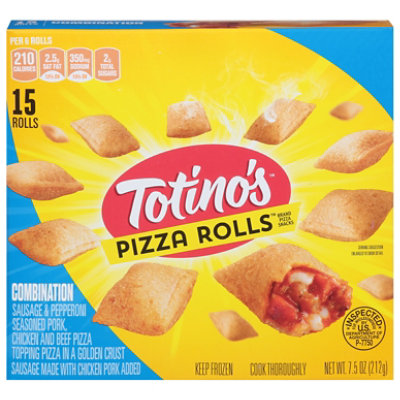 Totino's Pizza Rolls Combination Pizza Snacks - H-E-B Preparation instructions. Cook thoroughly. Classic: Oven & Toaster Oven: 1. Heat oven to 425 degree F. 2. Place rolls in single layer on baking sheet or toaster oven tray. Bake according to chart. 3. Let stand 2 minutes to complete cooking. Filling will be very hot. Calories in Totinos Pizza Rolls Combination - Menu With Nutrition There are 210 calories in 6 rolls (85 g) Totinos Pizza Rolls Combination; click to get full nutrition facts and other serving sizes. Combination Pizza Snack Rolls Nutrition Facts - Eat This Much Combination Pizza Snack Rolls Kroger 1/4 cup 170.0 Calories 7.0 g 14.0 g 6 g 4 g 0 mg 1 g 115.0 mg 1 g 0 g Report a problem with this food Find on Amazon Totino's Pizza Rolls - Combination : calories, glucides et infos ... Trouvez les calories, les glucides et les contenus nutritionnels de cet aliment (Totino's Pizza Rolls - Combination) et de plus de 2 000 000 autres sur MyFitnessPal. ... Totino's Pizza Rolls Totino's Pizza Rolls - Combination. Portion : 6 Pizza Rolls (85g) 210 Cal. 49% 26g Glucides. 38% 9g Lipides. 13% 7g Protéines. Avec MyFitnessPal ...