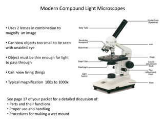 What is a Compound Microscope? - New York Microscope Company A compound microscope is an instrument that is used to view magnified images of small objects on a glass slide. ... The Characteristics of a Compound Microscope. Two or more convex lenses; Typical magnification range between 40x and 1000x ... If you hear either of the terms "brightfield microscope" or "transmitted light microscope," it is ...