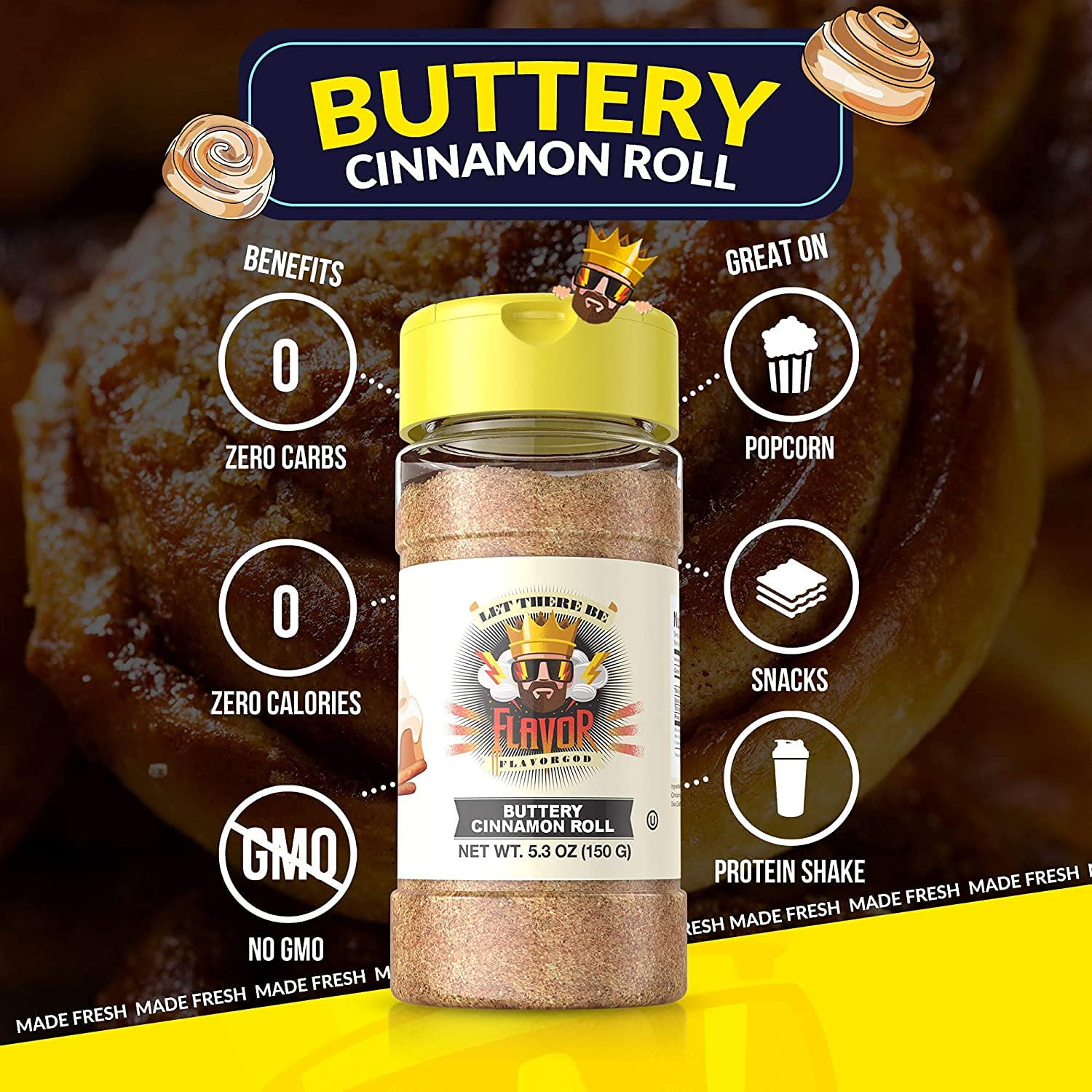 Flavor God Buttery Cinnamon Roll Topper Seasoning Blend 5.3 Oz Bottle ... Cinnamon Rolls are a comfort food loved by all ages and enjoyed year-round. That's why Flavor God decided to create Buttery Cinnamon Roll Topper — a sweet and savory topper blend that tastes like delicious glazed cinnamon rolls fresh out of the oven. Flavor God's version is that of Sunday mornings — minus all the calories and guilt!