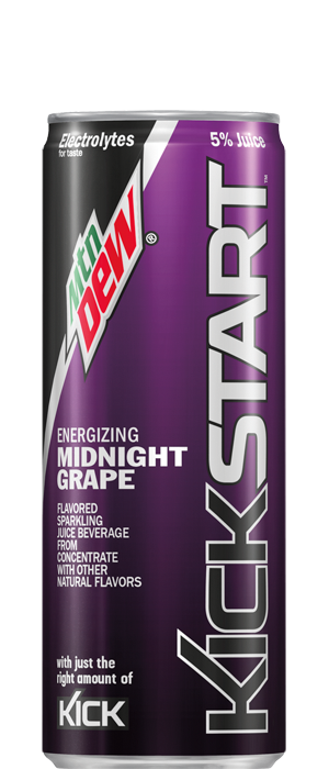 Mountain Dew Kickstart Grape Energizing Juice 16 oz Can Mtn Dew Kickstart Grape combines the great taste of DEW with real fruit and electrolytes for taste. Packaging may vary. Grape flavor. 5% juice. Electrolytes for taste. Juice + Caffeine + DEW. We aim to show you accurate product information.