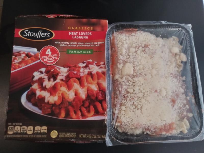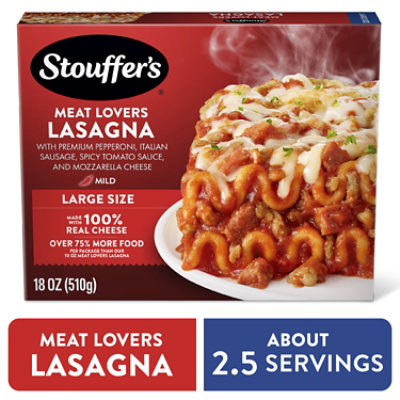 Stouffer's Meat Lovers Lasagna Large Family Size Meal, 57 oz (Frozen ... One 57 oz box of Stouffer's Large Family Size Meat Lovers Lasagna Frozen Meal. This Stouffer's Large Family Size frozen dinner is packed with quality ingredients and homemade flavor. Includes frozen lasagna with hearty tomato sauce, pepperoni, Italian sausage, ground beef and pork. This frozen pasta dinner offers 16 grams of protein per serving.