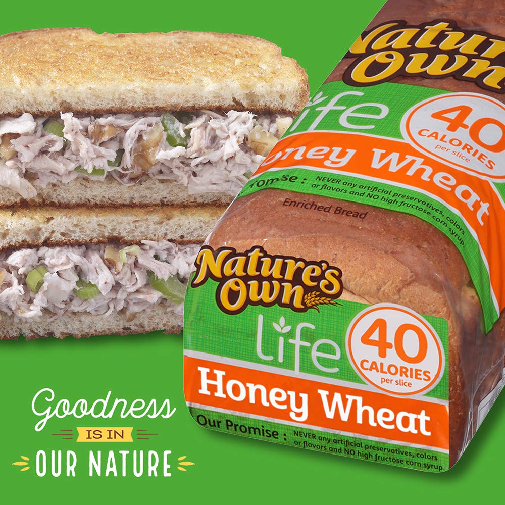 Nature's Own Life 40 Calorie Honey Wheat Bread Great for your tastebuds with a hint of honey, it's also great for your waistline with 40 calories in every slice. • Honey wheat bread • Pre-sliced • 40 calories per slice • Good source of fiber • Cholesterol-free • Low fat • No high fructose corn syrup • No artificial preservatives, colors or flavors Preparation instructions Honey Wheat — Nature's Own Nature's Own offers a wide range of tastes, textures, and nutritional benefits. To include whole grain and whole wheat in your diet, explore product options like: 100% Whole Wheat, 100% Whole Wheat with Honey, 100% Whole Grain, and Sugar-Free 100% Whole Grain, all four of which are a good source of whole grains. Natures Own Life Honey Wheat 40 Calories per Slice Keto ... Keto friendly. A low fat food. A cholesterol free. 35% less sodium (Nature's Own 40 calorie Honey Wheat Bread: 140 mg sodium and 6 g fiber per 45 grams). 3 x fiber (Wheat Bread per USDA FoodData Centra Database, April 1, 2020. 213 mg of sodium and 2 g fiber per 45 grams). than other wheat breads. No. 1 selling bread brand (Nature's Own is the ...