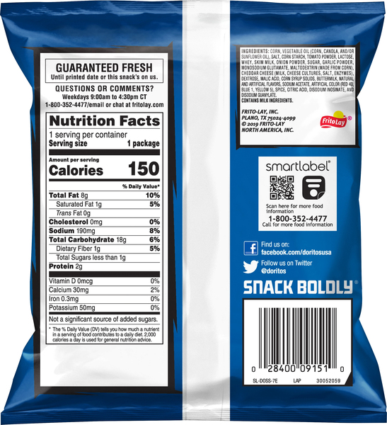 DORITOS® COOL RANCH® Flavored Tortilla Chips However, we recommend that you check the label on a specific product for the most current and accurate nutritional information. If you need assistance, please contact Consumer Relations toll-free at 1-800-352-4477 Monday through Friday between 9:00 a.m. and 4:30 p.m. Central Standard Time.