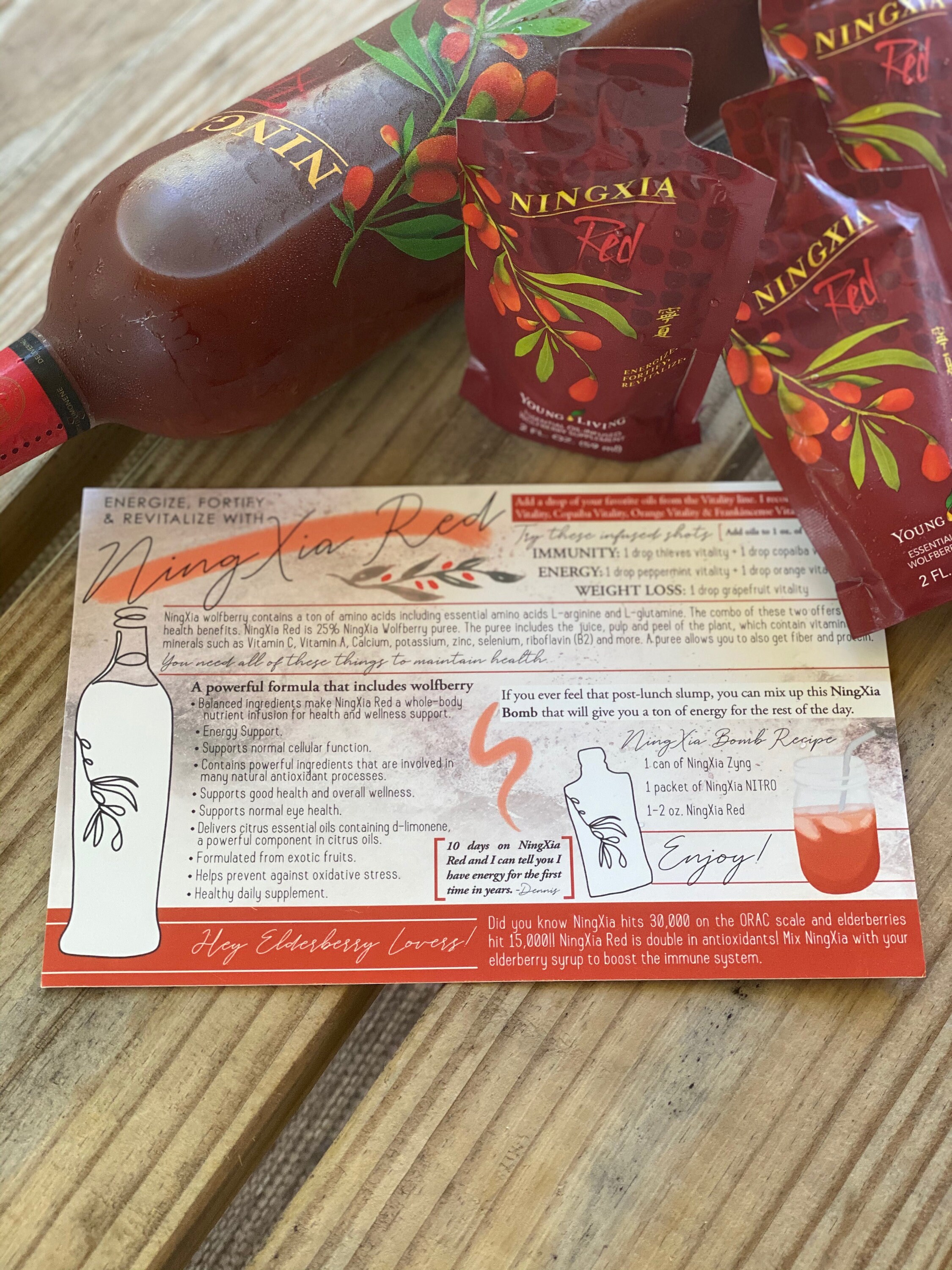 The Famous NingXia Red - The Oil Dropper NingXia Red® is a powerful antioxidant drink that contains whole Ningxia wolfberry puree—a super blend of blueberry, aronia, cherry, pomegranate, and plum juices, natural stevia extract, grape seed extract, pure vanilla extract, and orange, yuzu, lemon, and tangerine essential oils. All About Ningxia Red - GRAYSKY MATTERS 1 oz of Ningxia Red has the antioxidant power of 100 oranges, 814 blueberries, 22 carrots, 10 lbs of spinach, 59 broccoli florets, 73 strawberries, 93 apples, 34 large onions, 55 lbs of almonds. 18 amino acids. <1 g protein. 22 trace minerals. 5 essential fatty acids. What is NingXia Red? | Young Living Essential Oils NingXia Red® contains whole Ningxia wolfberry puree, which contains more antioxidants than just juice; a super blend of blueberry, Aronia, cherry, pomegranate, and plum juices; natural stevia and pure vanilla extracts; and Orange, Yuzu, Lemon, and Tangerine essential oils. NingXia Red provides a whole-body nutrient infusion. NingXia Greens: Fruit & Vegetable Supplement Powder - Young Living Apple, Banana, Lemon, Wolfberry sprouted leaves, Alfalfa, Kale, Parsley, Broccoli, Fermented superfood blend (Grape, Brown rice, Carrot, Apple, Daikon radish, Cabbage, Celery, Cucumber, Banana, Onion, Burdock, Spinach, Pear, Orange peel, Tomato, Sweet pepper, Mung bean sprout, Eggplant, Lotus rhizome, Pumpkin, Shiitake mushroom, Ginger, Lettuce, …