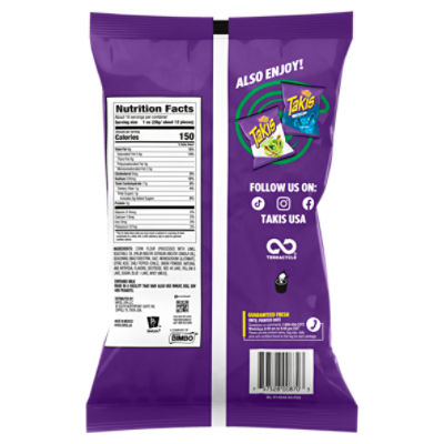 Takis (History, FAQ, Flavors & Commercials) - Snack History Takis is an iconic rolled corn tortilla chip. Check out this article if you want to find out more about its history, ingredients, and flavors ... Takis Nutrition. Takis Fuego Serving Size: 13 pieces (30g) % Daily Value* Amount Per Serving : Calories from Fat : 74 : Calories : 156 : Total Fat : 8.2g : 13% : Saturated Fat :
