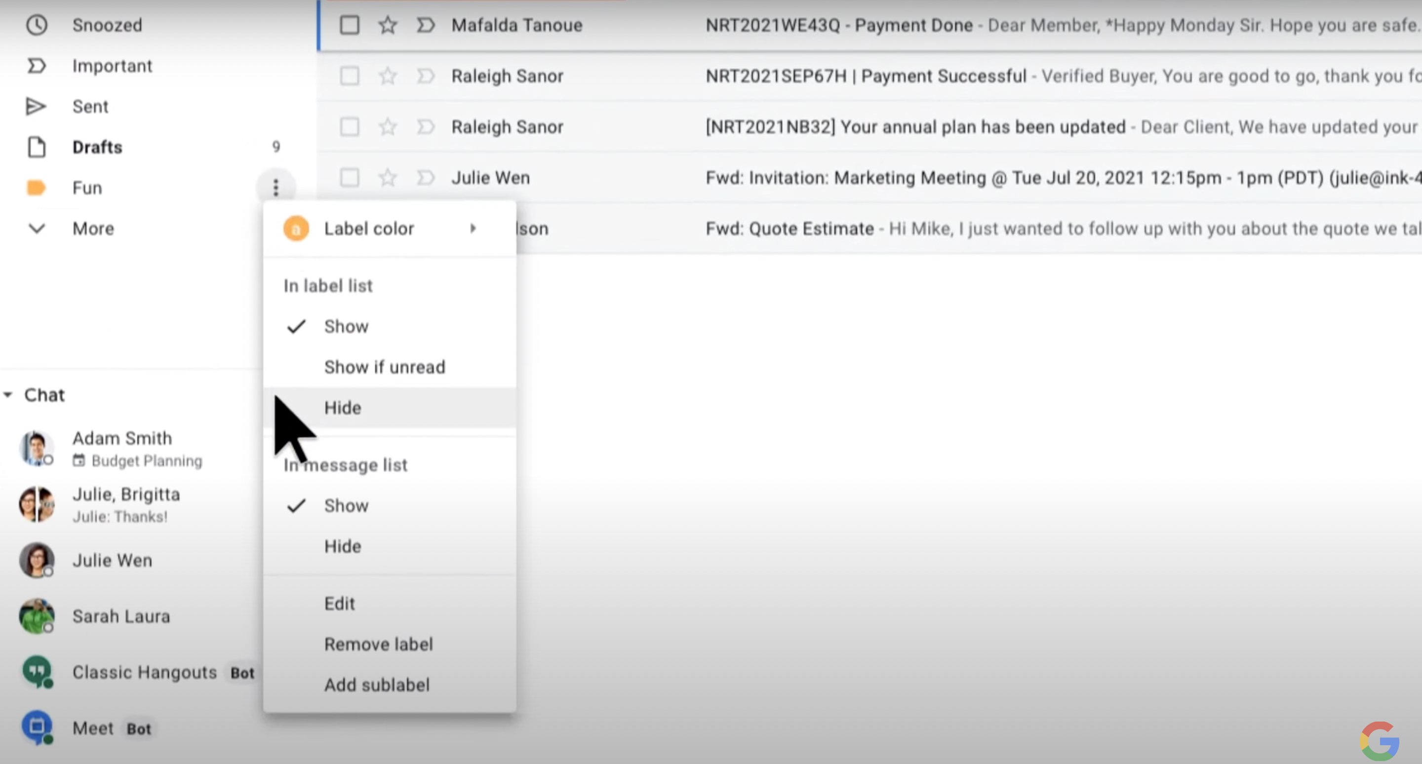 Hide label from inbox gmail. Create labels to organize Gmail - Computer - Gmail Help On your computer, go to Gmail. On the left, scroll down, then click More. Click Create new label. Name your label. Click Create. Edit & delete labels Edit a label Delete a label Add a... How to Show or Hide Labels in Gmail - ExcelNotes Step 1: Login your Gmail account (please refer here to open one if you do not have an account yet); Step 2: In the Gmail account, click the "Setting" button from the right-top corner; Step 3: Click the "Settings" command from the drop-down list; Step 4: Click the "Labels" tab in the settings menu; Step 5: Check the labels you want to show or hide; How to tame your Gmail inbox with labels - The Verge Tap on the three-line hamburger icon in the top left corner. Scroll down and select "Settings.". Tap on the Gmail account you want to tweak. Scroll down to and select "Manage labels.". On ... How to Use Gmail Labels (Step-by-Step Guide w/ Screenshots) Here's how you can color-code labels in Gmail: Step 1. Open Gmail and find the label you want to color-code from the sidebar on the left. Step 2. Hover your cursor over the label, and click the three dots icon that appears. Step 3. Click on Label color and pick a color you want to use for the label.